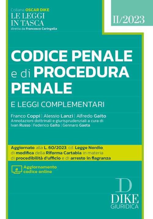 Aggiornato a: L. 24 maggio 2023, n. 60, in materia di procedibilità d'ufficio e di arresto in flagranza. Corte Cost. 5 giugno 2023, n.111, di illegittimità costituzionale dell'art. 64, comma, c.p.p. L. 26 maggio 2023, n. 56, conv. D.L. 34/2023, in materia di contrasto alla violenza nei confronti del personale sanitario. L. 5 maggio 2023, n. 50, conv. D.L. 20/2023 (cd Decreto Cutro), in materia di ingresso legale dei lavoratori stranieri e di prevenzione e contrasto all'immigrazione irregolare. L'opera contiene disposizioni in tema di: Armi, Casellario giudiziale, Depenalizzazione, Disposizioni penali del codice della strada, Giudice di pace, Giustizia minorile, Mafia, Mandato d'arresto europeo, Ordinamento penitenziario, Ordine europeo di indagine, Ordine e sicurezza pubblica, Prostituzione, Reati bancari, Reati della intermediazione finanziaria, Reati fallimentari, Reati societari, Reati tributari, Reddito di cittadinanza, Responsabilità delle persone giuridiche, Stupefacenti, Ufficio per il processo, Usura e composizione delle crisi da sovraindebitamento.